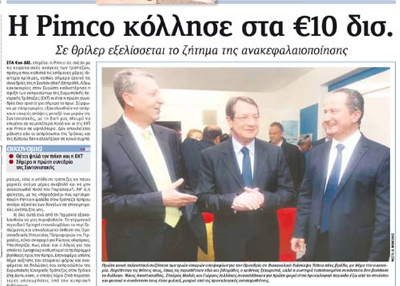 «Ο Φιλελεύθερος» γράφει στο κύριο του θέμα, με τίτλο «Η Pimco κόλλησε στα €10 δισ.» ότι η Pimco επιμένει στα €10 δισ. για τις κεφαλαιακές ανάγκες των τραπεζών κάτι που καθιστά τις επόμενες μέρες ιδιαίτερα κρίσιμες. Η εφημερίδα επικαλείται πληροφορίες σύμφωνα με τις οποίες εξακολουθούν να υπάρχουν ισχυρές απόψεις μεταξύ των μερών της Συντονιστικής, με τη δική μας πλευρά να επιμένει σε χαμηλότερα ποσά και οι της ΕΚΤ και της Pimco σε ψηλότερα. Σε άλλο της θέμα η εφημερίδα αναφέρεται σε απόφαση του Υπουργικού να αυξήσει τα τέλη σχεδόν σε όλες τις κατηγορίες αδειών εισόδου και απασχόλησης αλλοδαπών από τρίτες χώρες με σημαντικότερη αλλαγή την υποχρέωση για καταβολή χρηματικής εγγύησης και από τους αλλοδαπούς. Αλλού ο «Φ» γράφει ότι η αστυνομία επεκτείνει το μέτρο του ελέγχου των πολιτών που είναι οφειλέτες στο κράτος και στα οδοφράγματα για τροχαίες παραβάσεις.