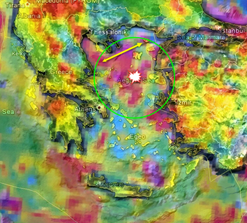Στη περίπτωση αυτή, αναμένονται σεισμοί και σε άλλα νησιά του Ανατολικού Αιγαίου, στη Ρόδο, στην Εύβοια και την Κρήτη υποθέτοντας ότι οι ασκήσεις έγιναν στα κέντρα του πράσινου και του κίτρινου κύκλου. Άν έγιναν σε άλλες περιοχές, βγάλετε τα ανάλογα συμπεράσματα. Η ιδέα δεν αλλάζει.